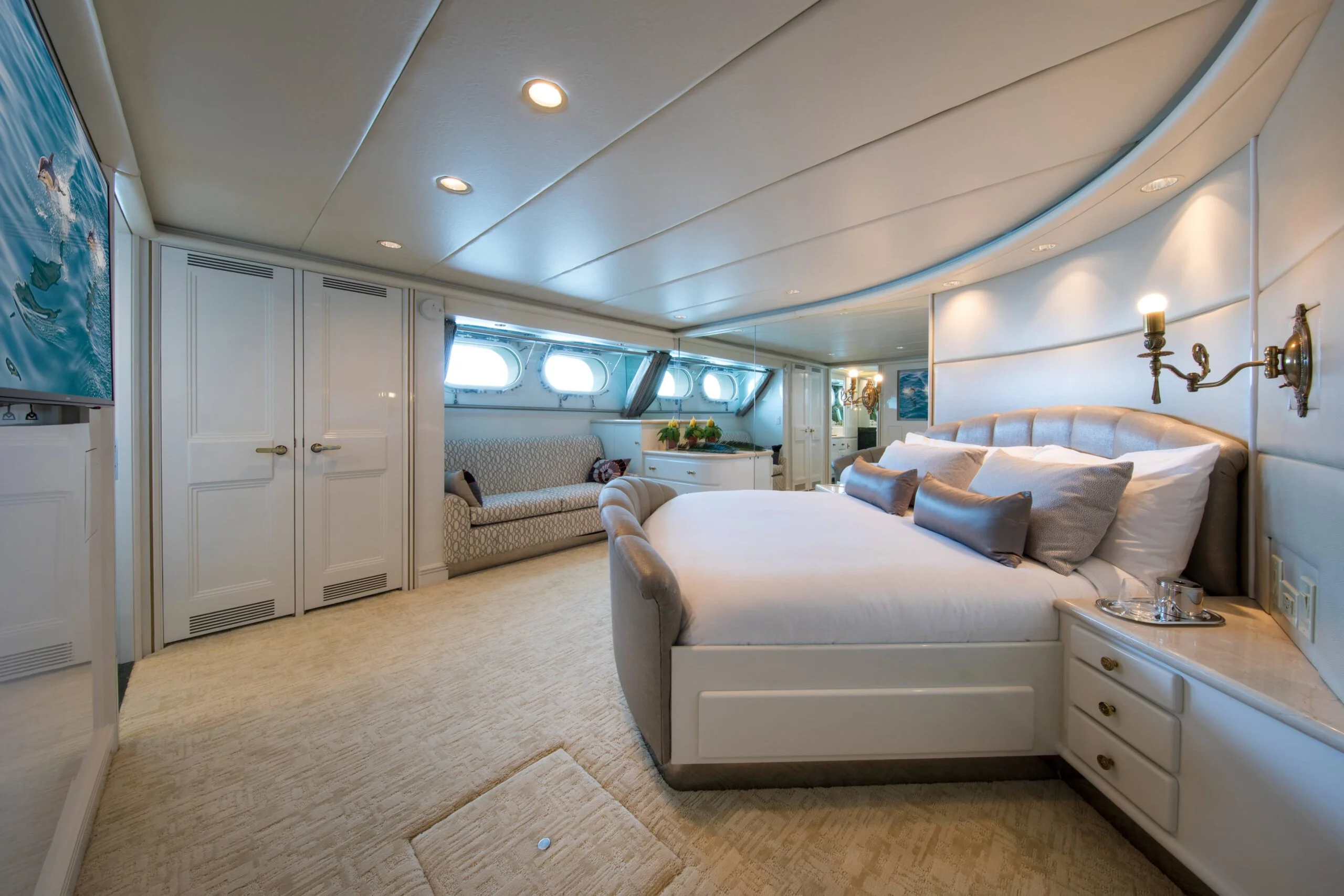 Elegant bedroom with double bed and scenic sea views on Grace Yacht