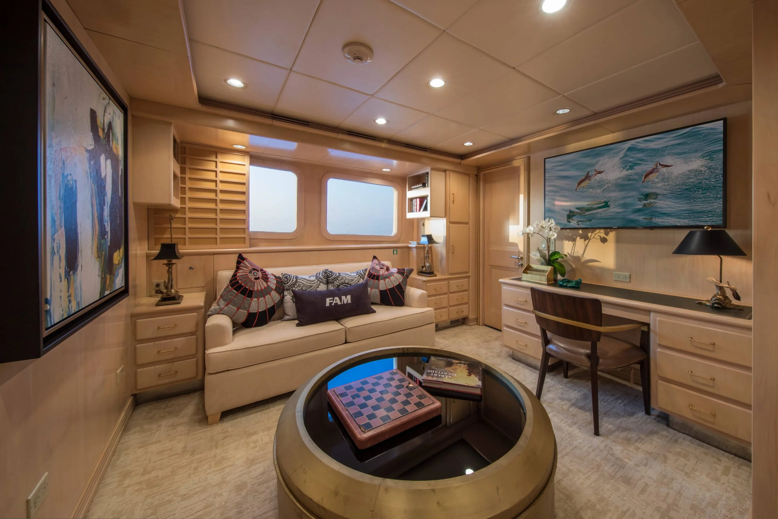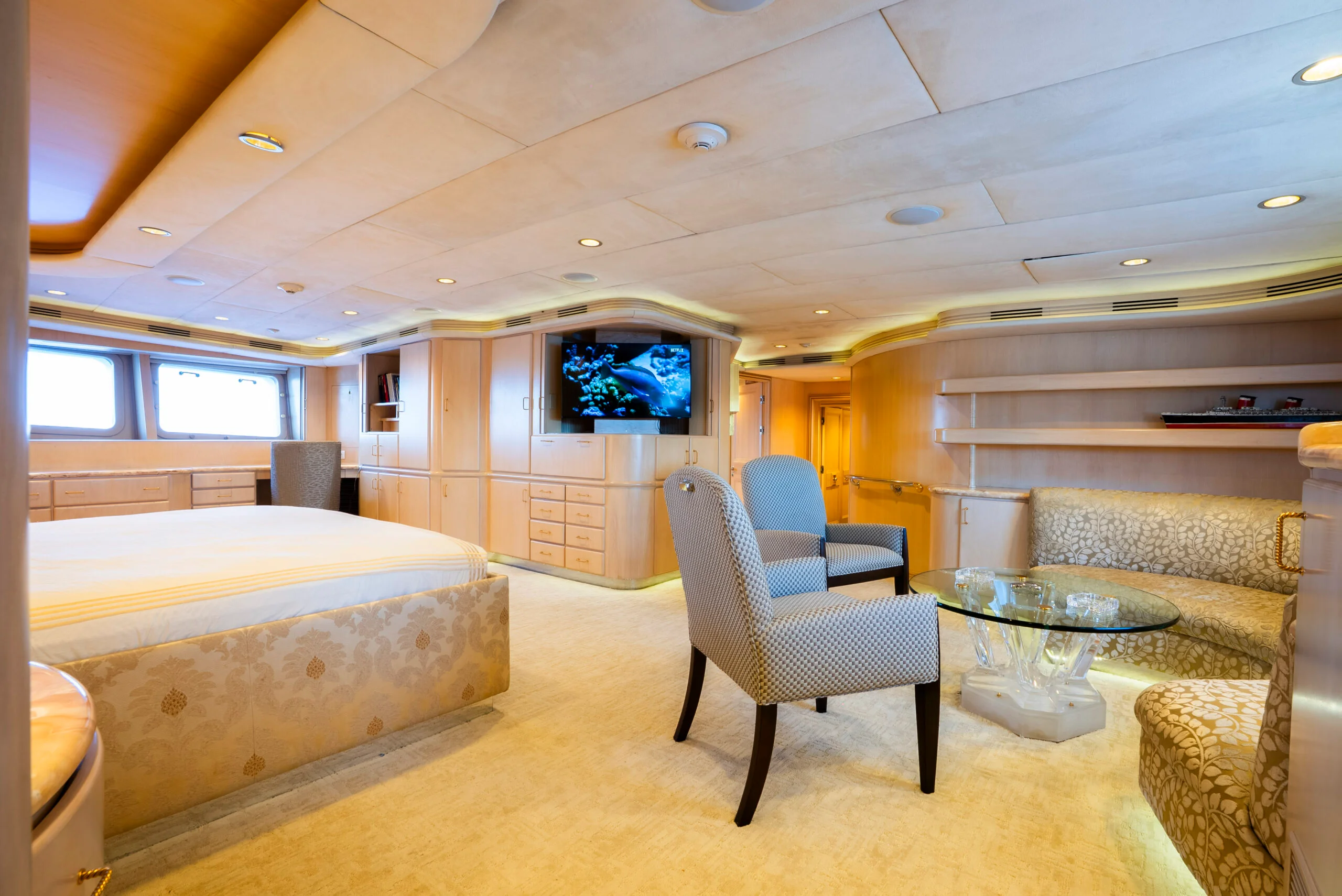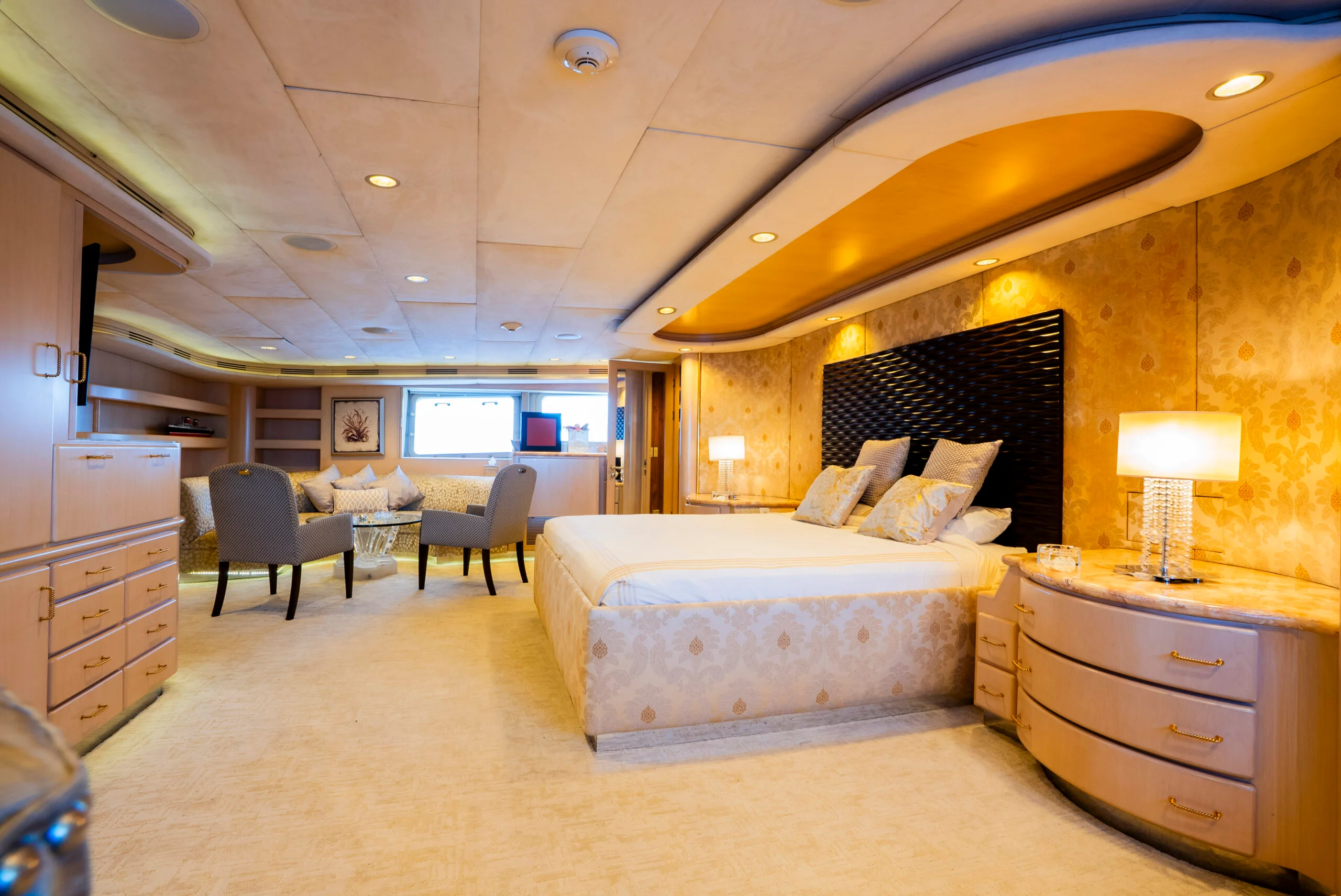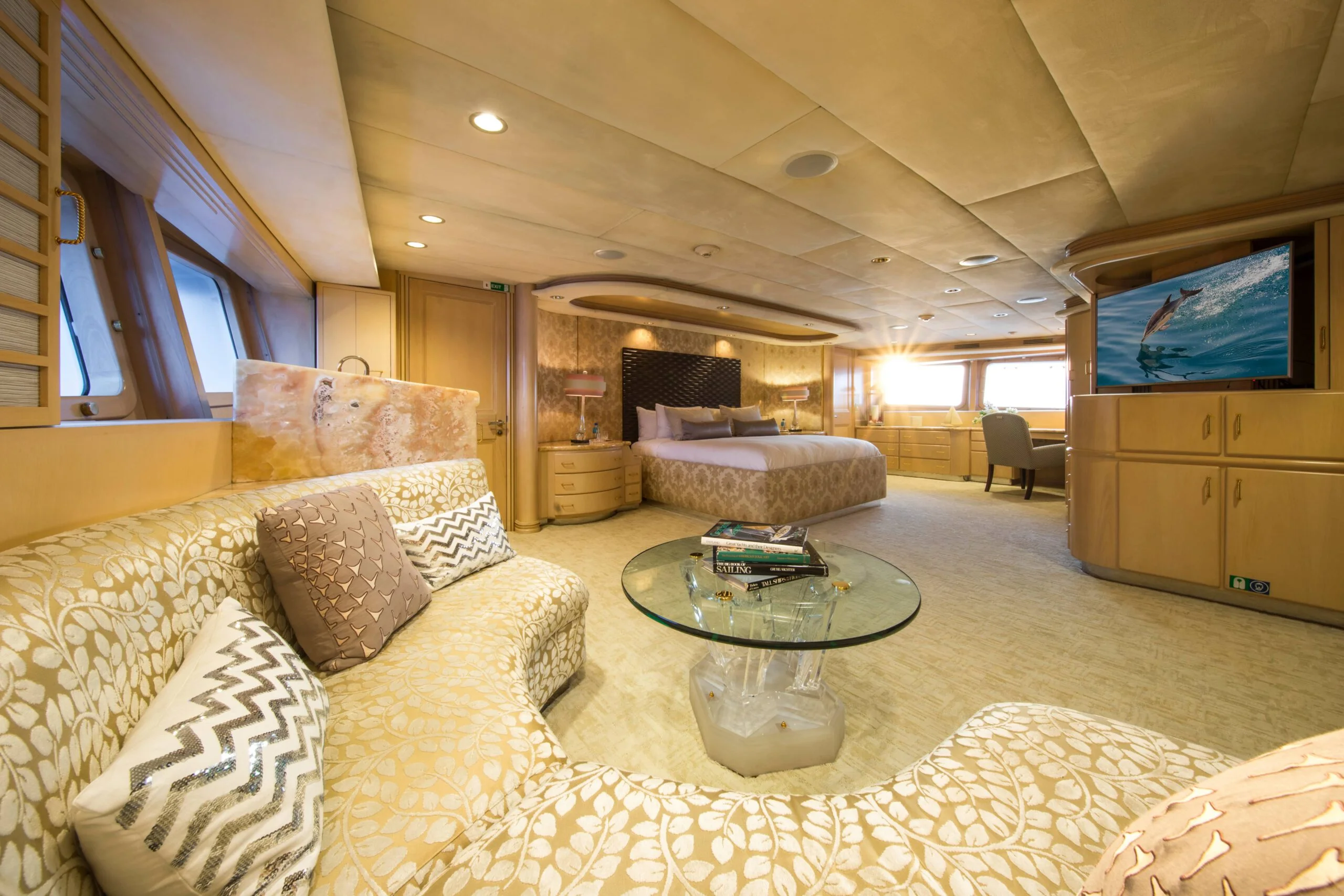 Elegant sofa seating in the luxurious yacht bedroom