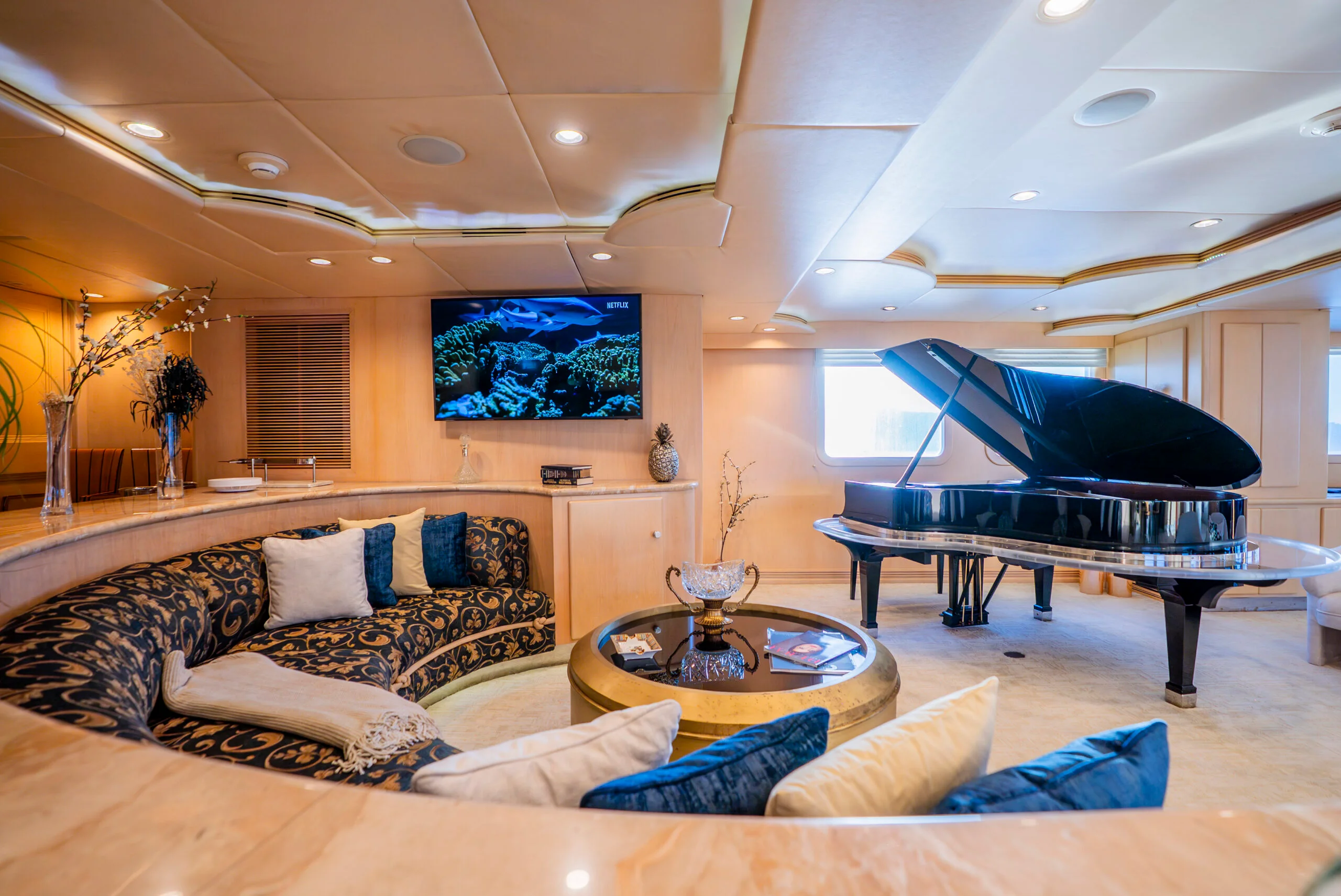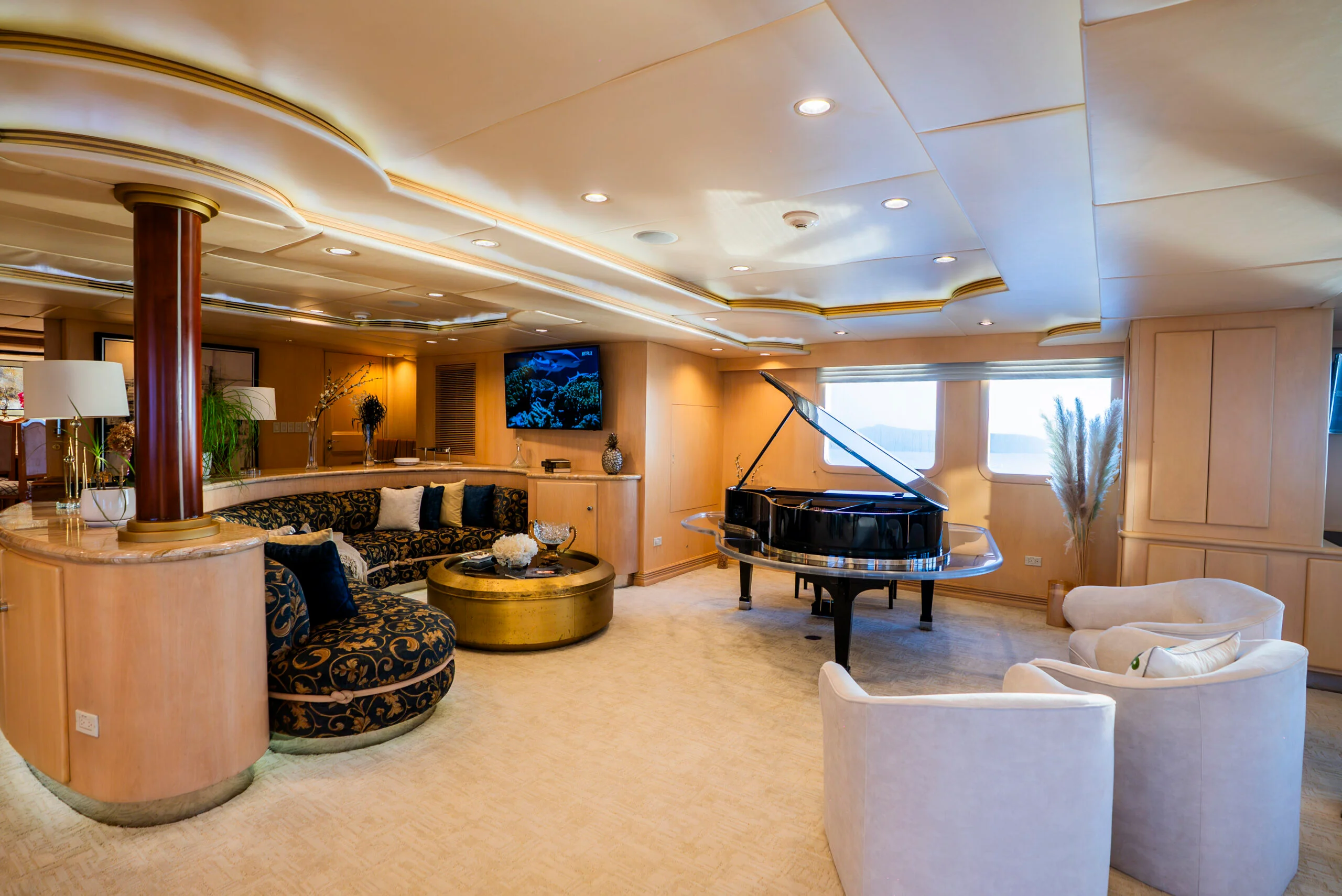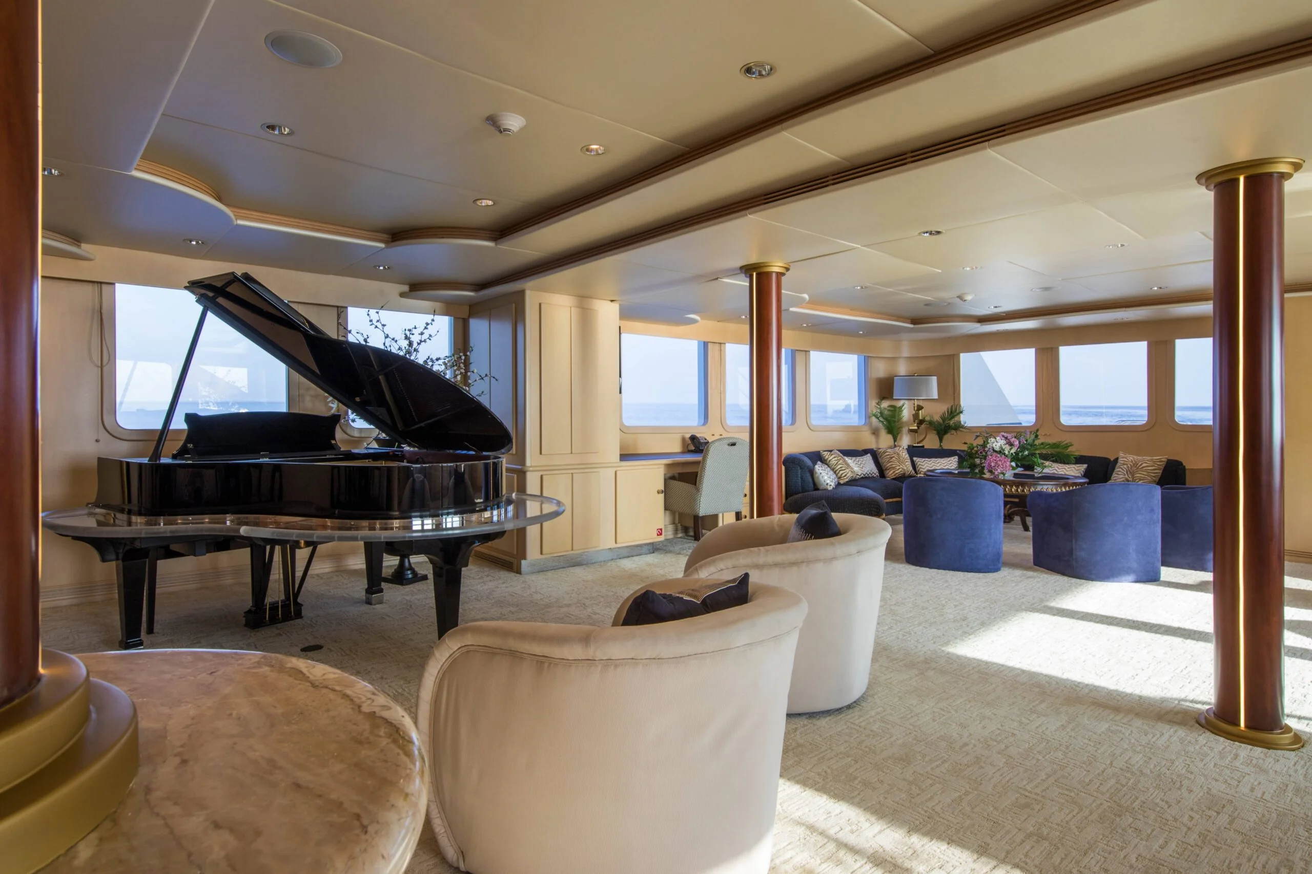 Enjoy live music and relaxing moments at the seating area in front of the grand piano on Grace Yacht