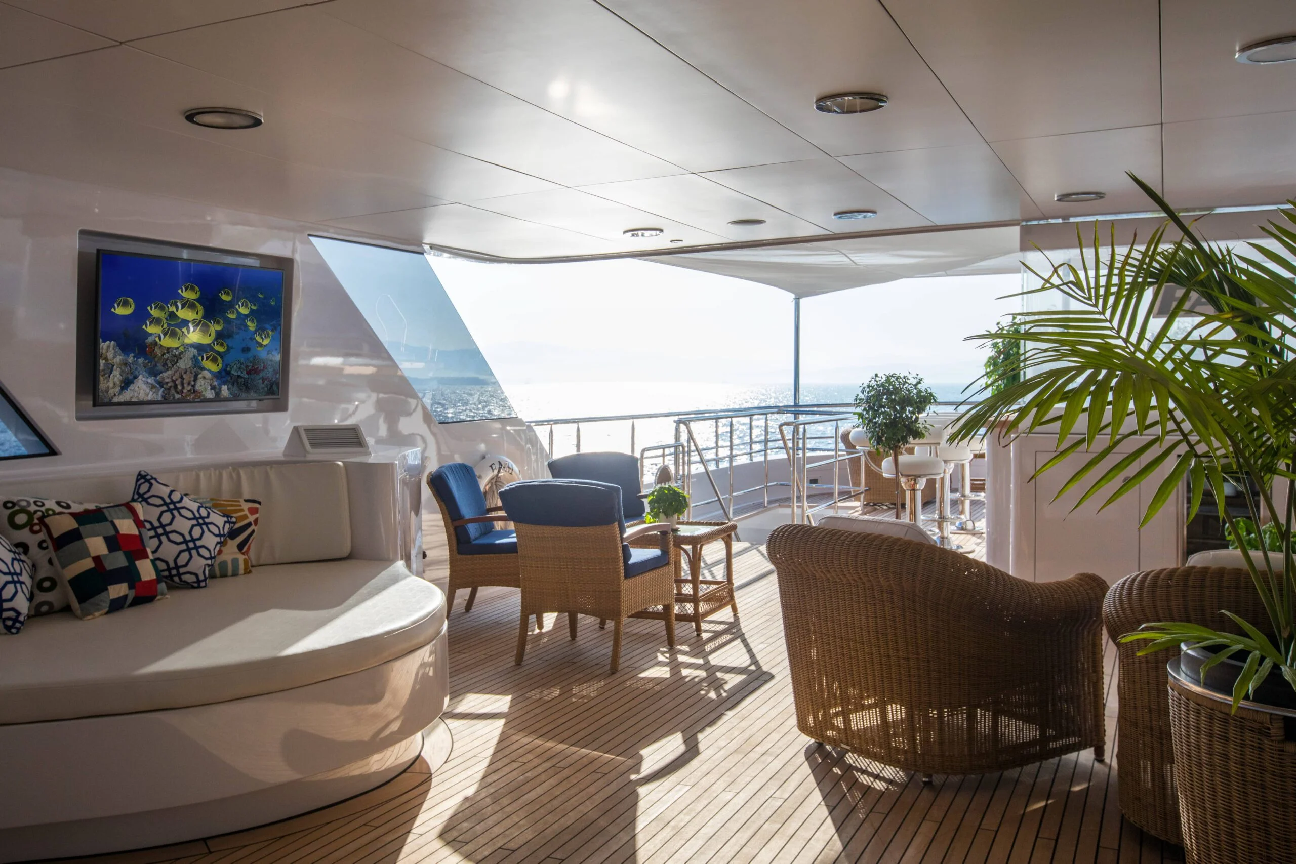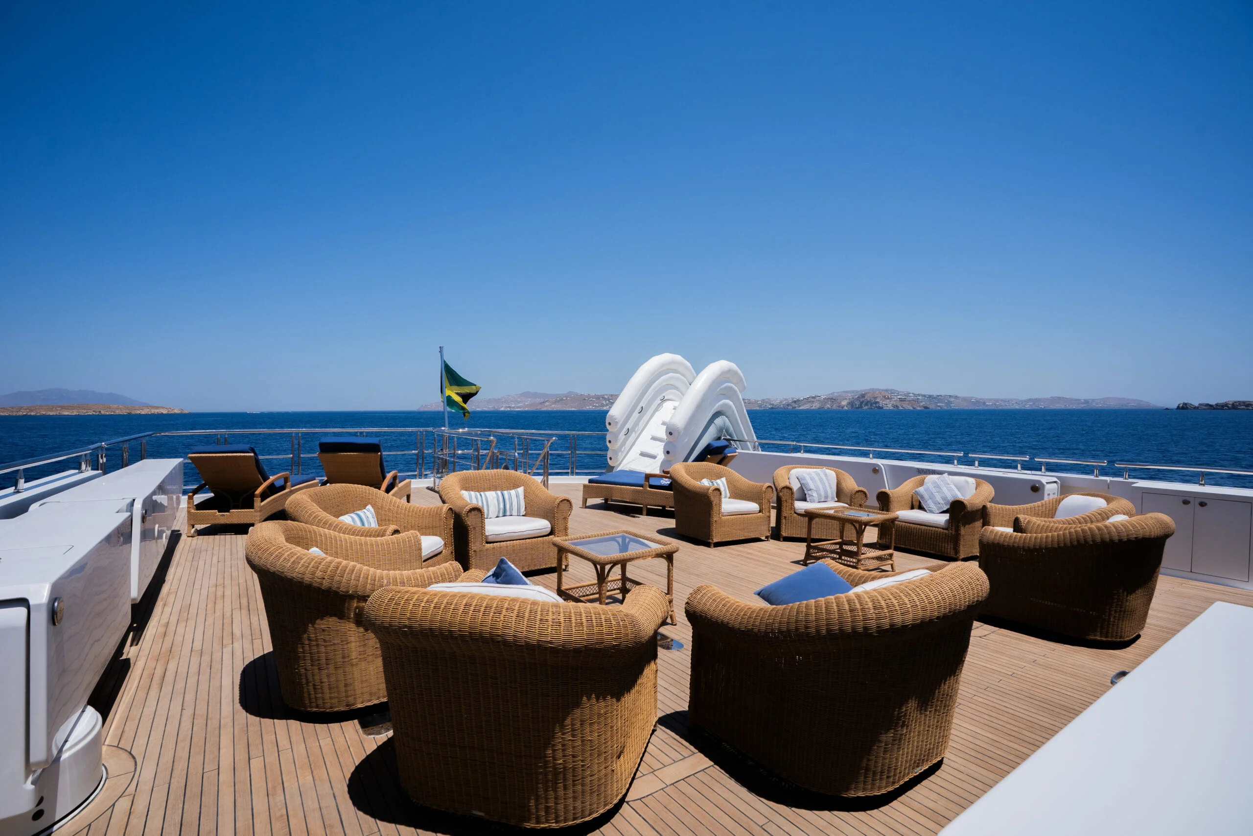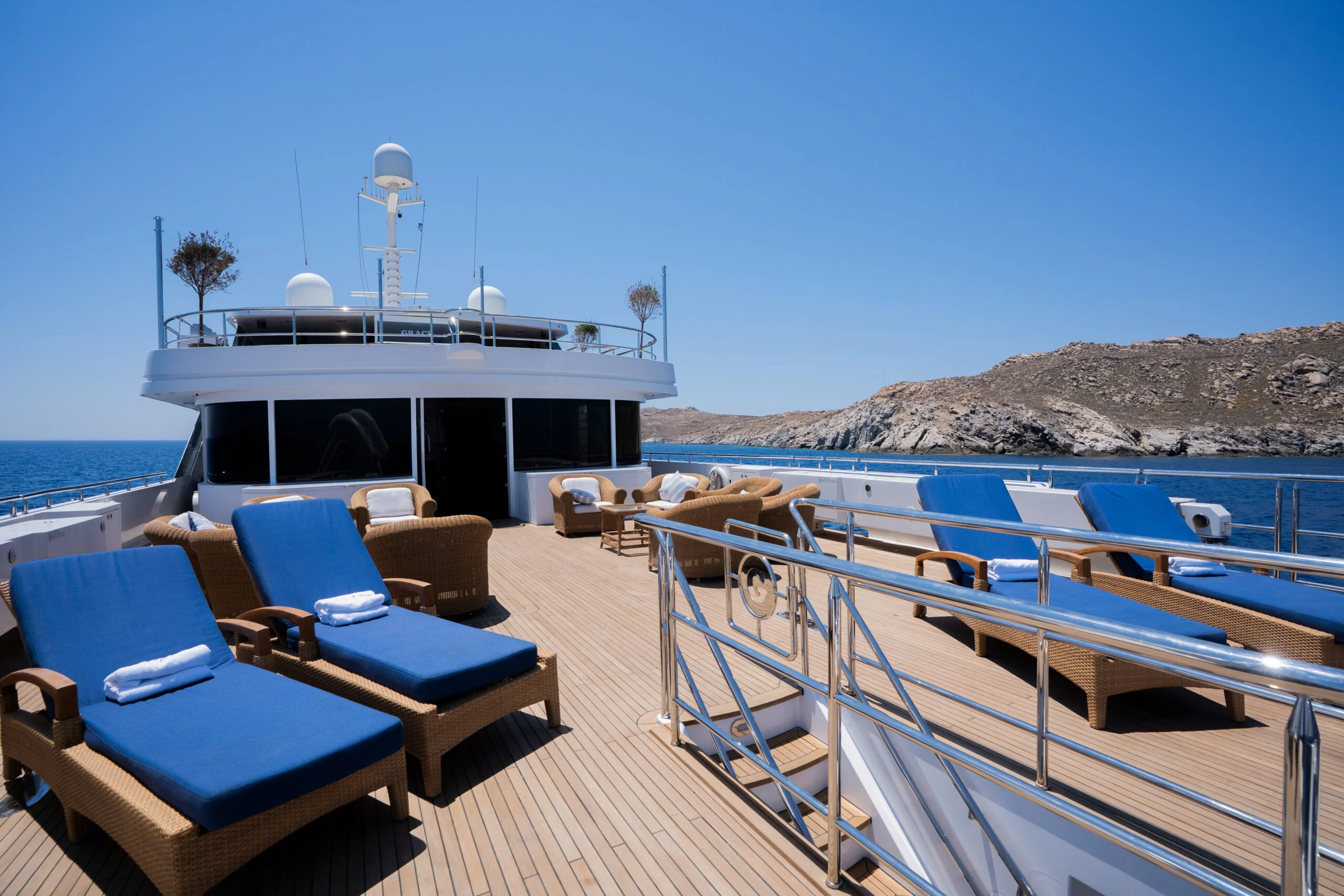 Relax on the sun deck of Grace Yacht, with a view of the engine area in the background