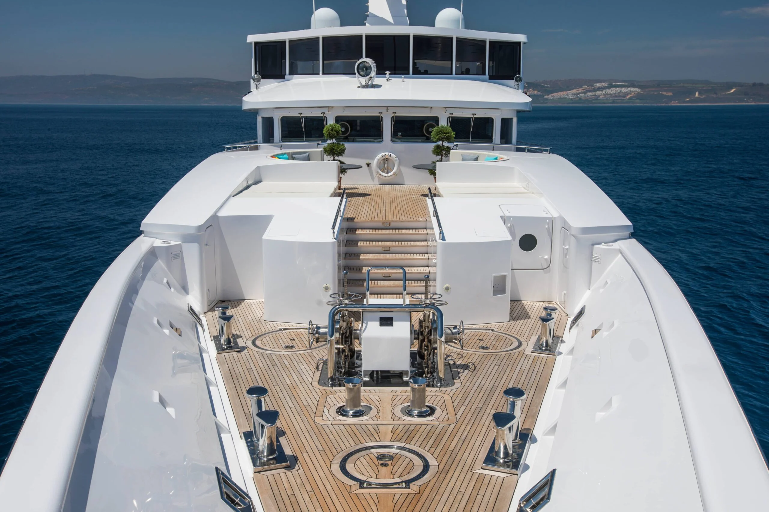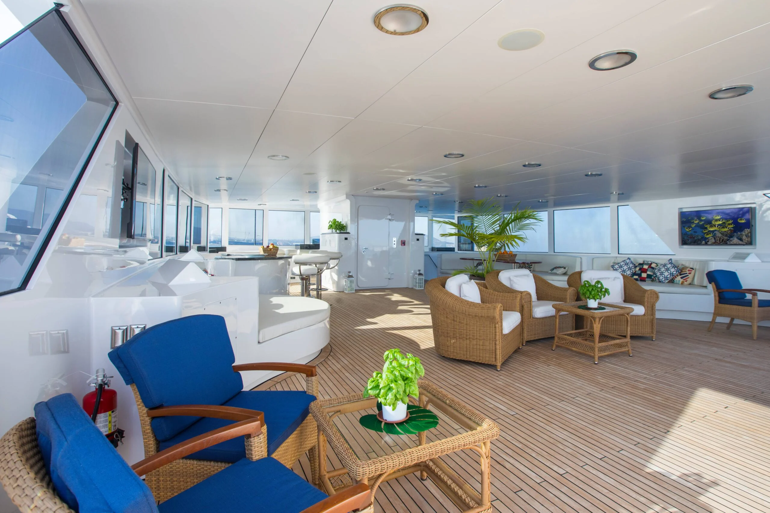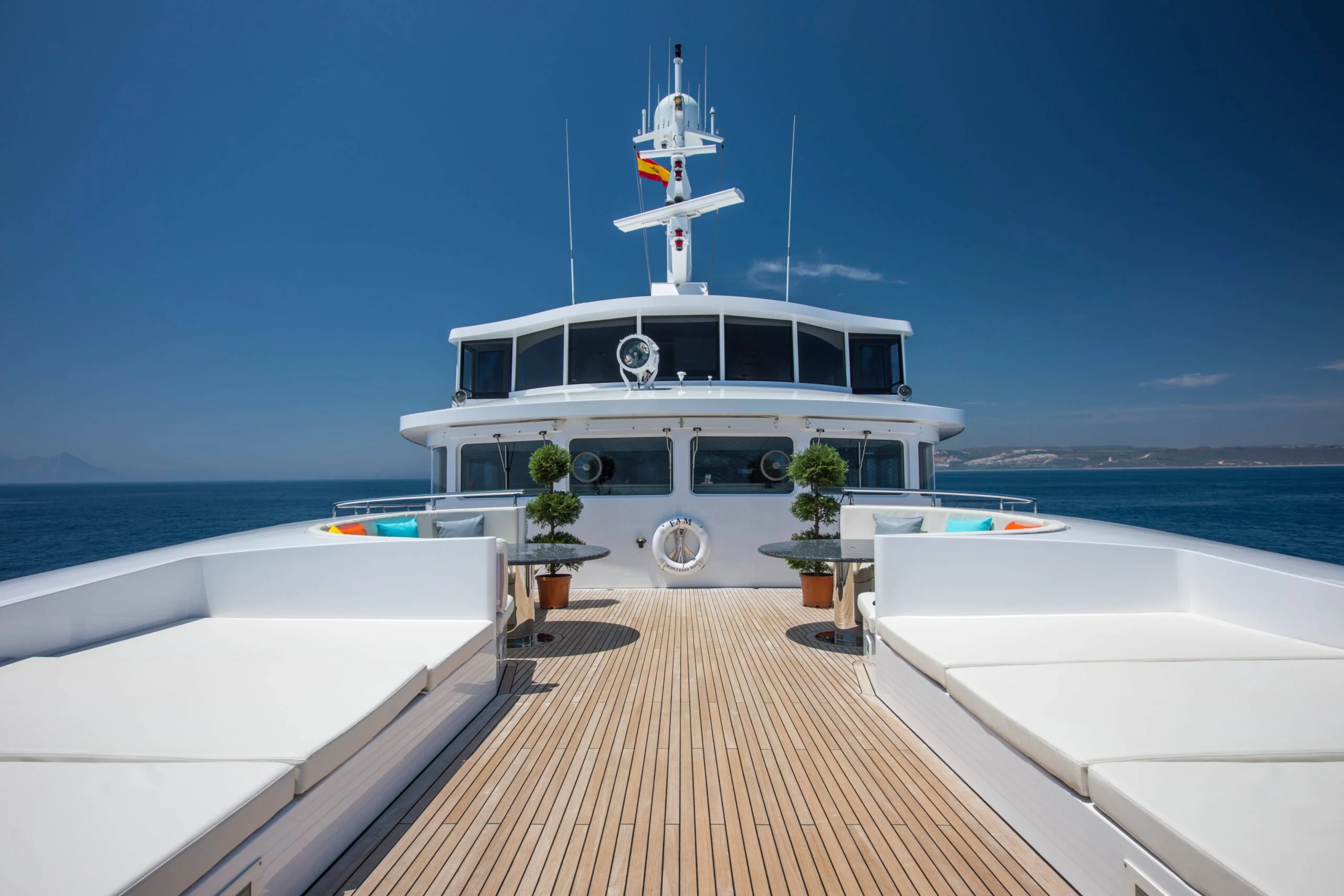 Relax on the sun deck of Grace Yacht, with a view of the engine area in the background