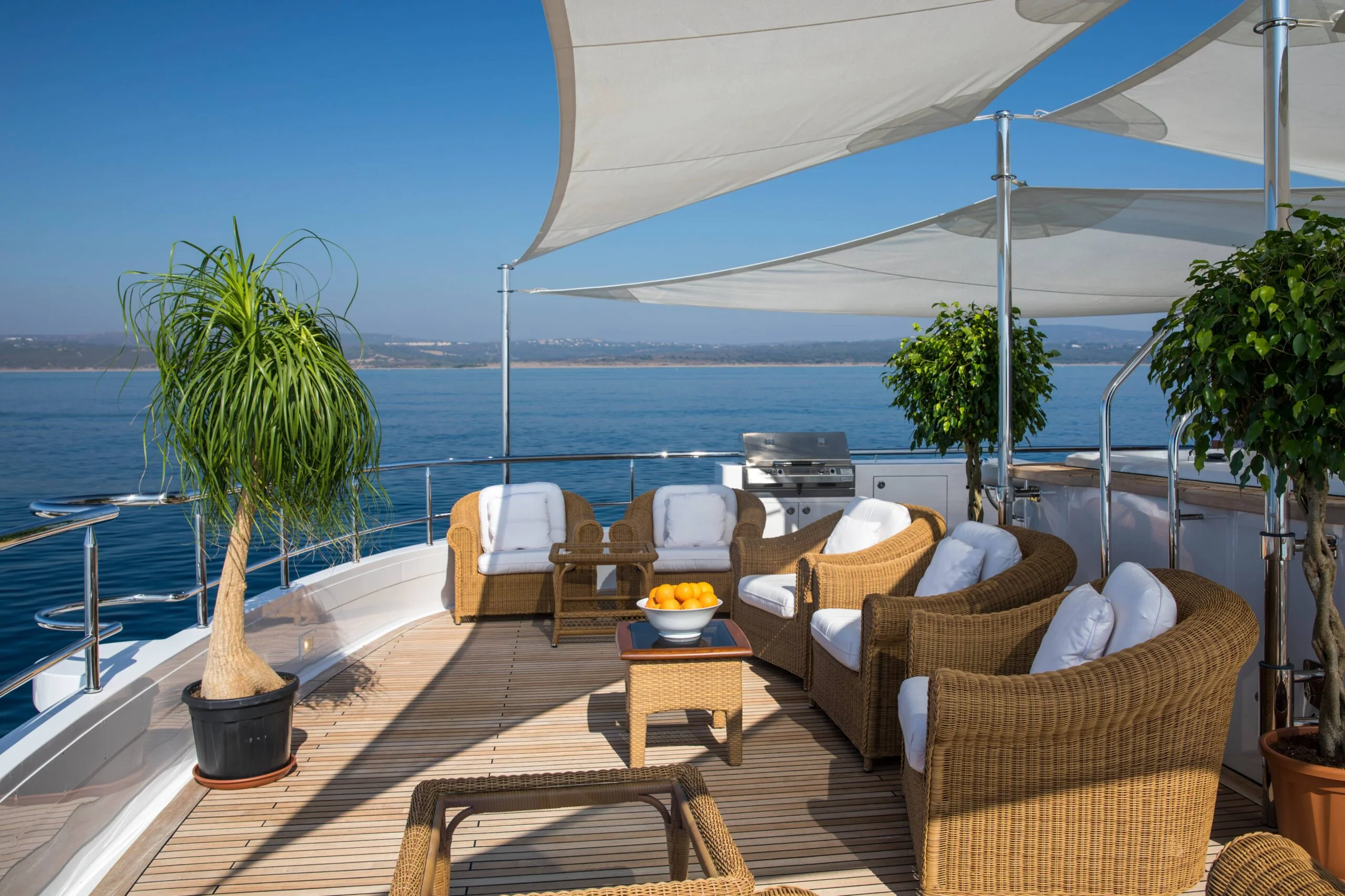 Enjoy the stylish terrace seating on Grace Yacht, perfect for relaxation and scenic views