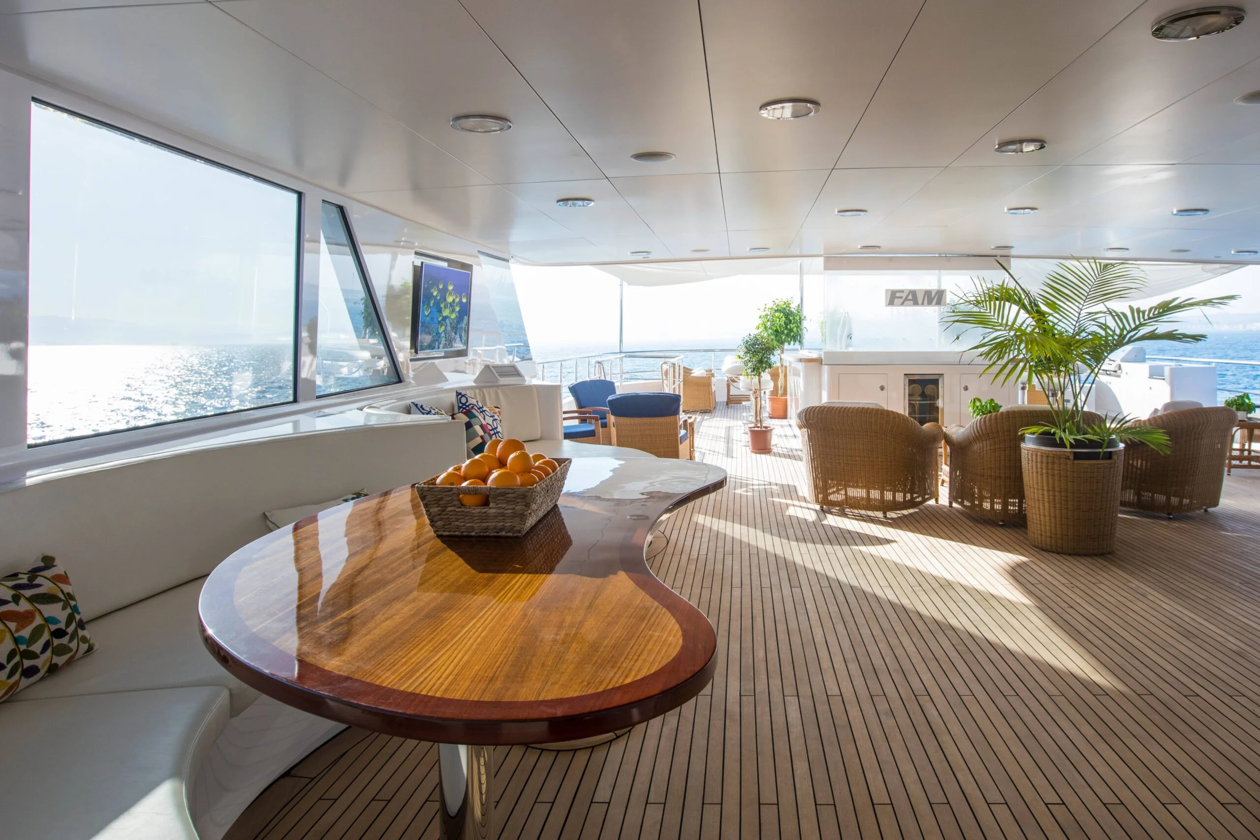 Elegant curved seating area with table inside Grace Yacht