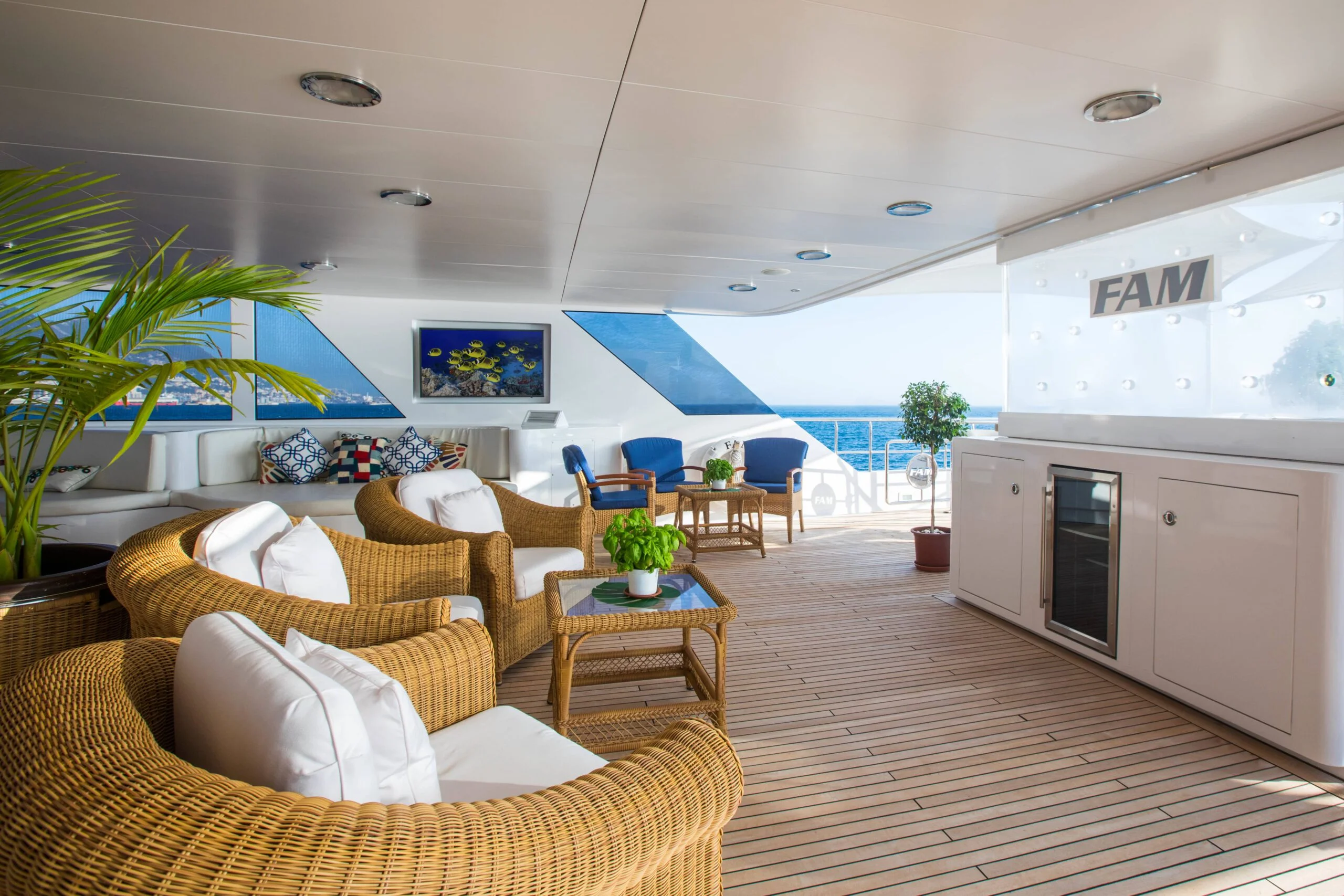 Relax on Grace Yacht’s outdoor sofas with small tables, and enjoy sunbathing on the loungers