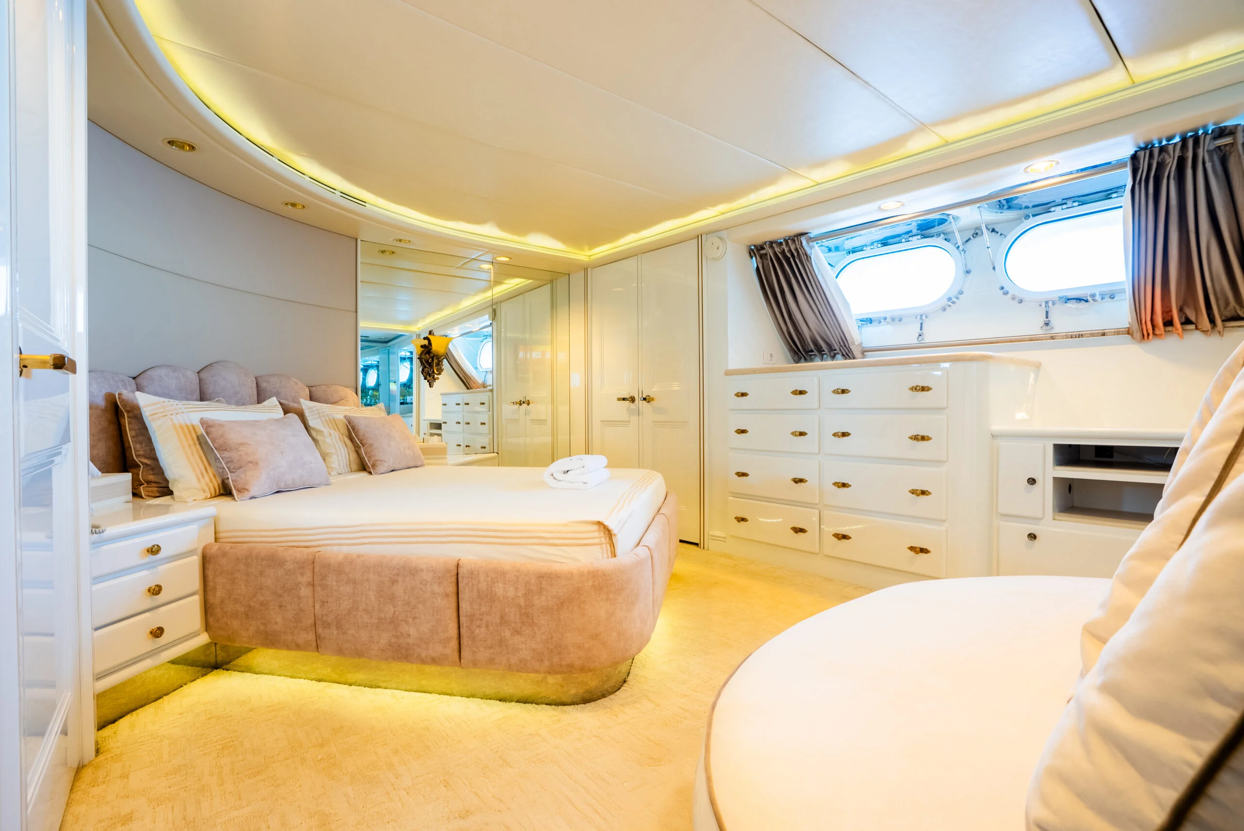 Cozy seating area and luxurious bed inside the Grace Yacht bedroom