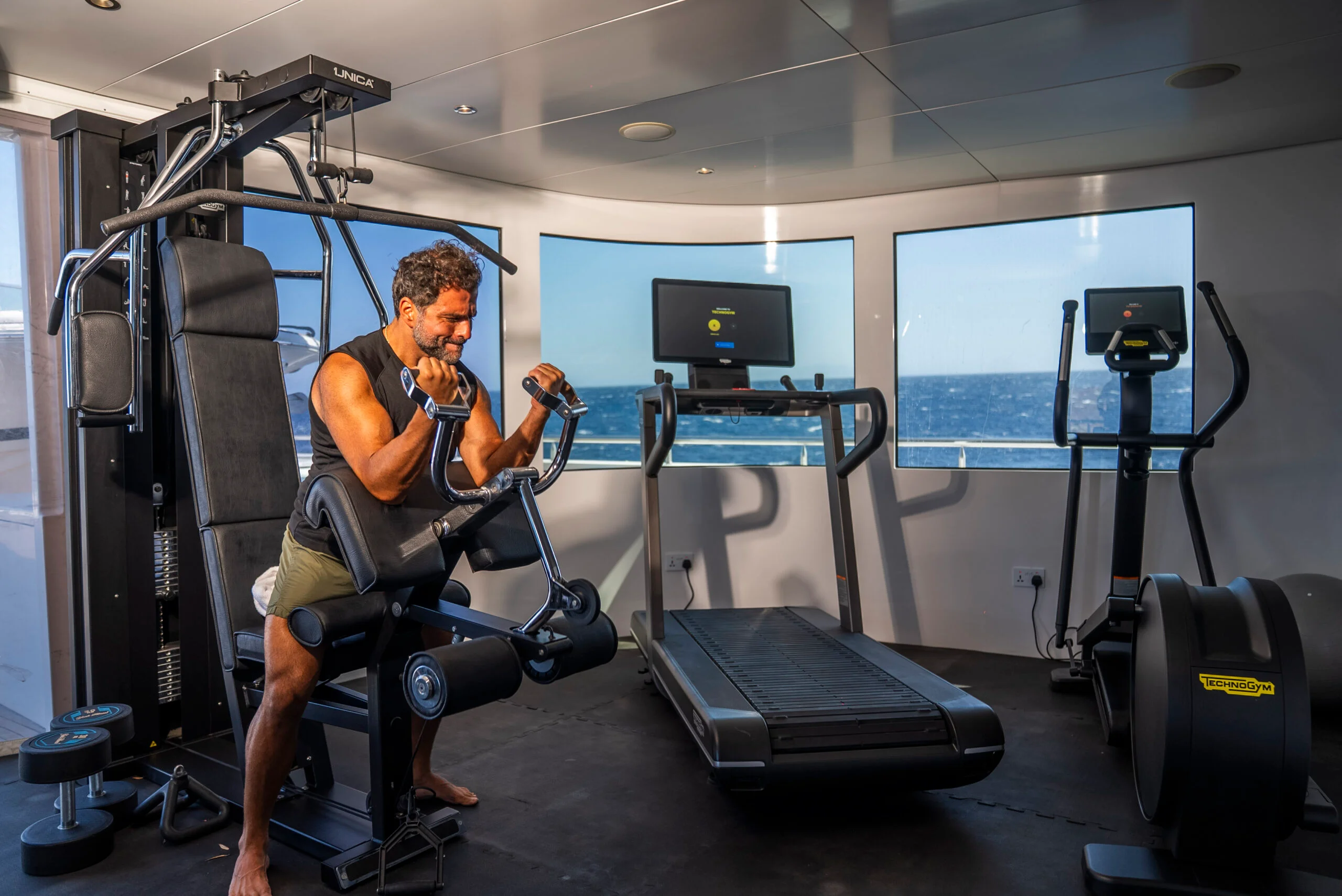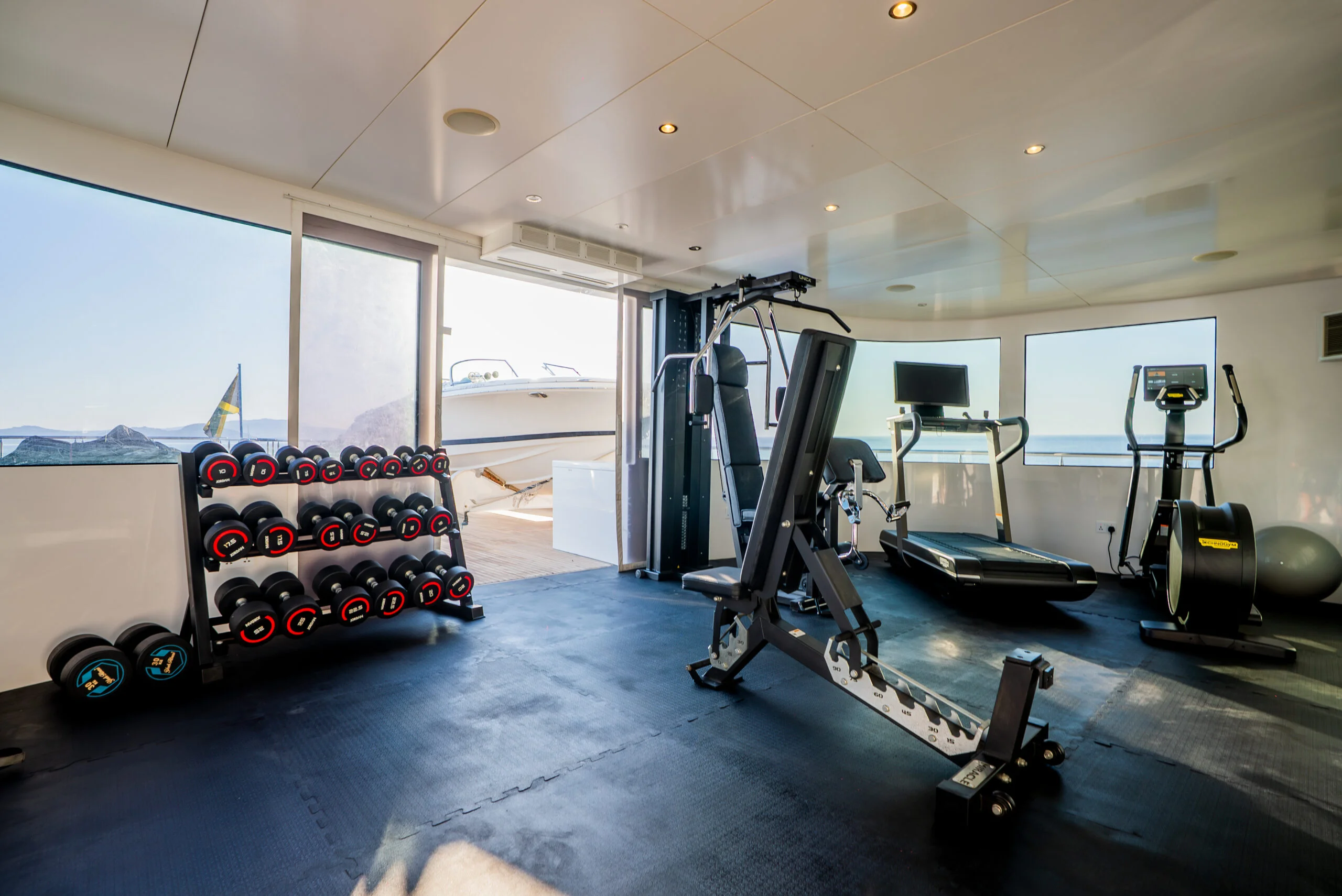 Stay fit aboard Grace Yacht in the fully equipped gym with stunning sea views