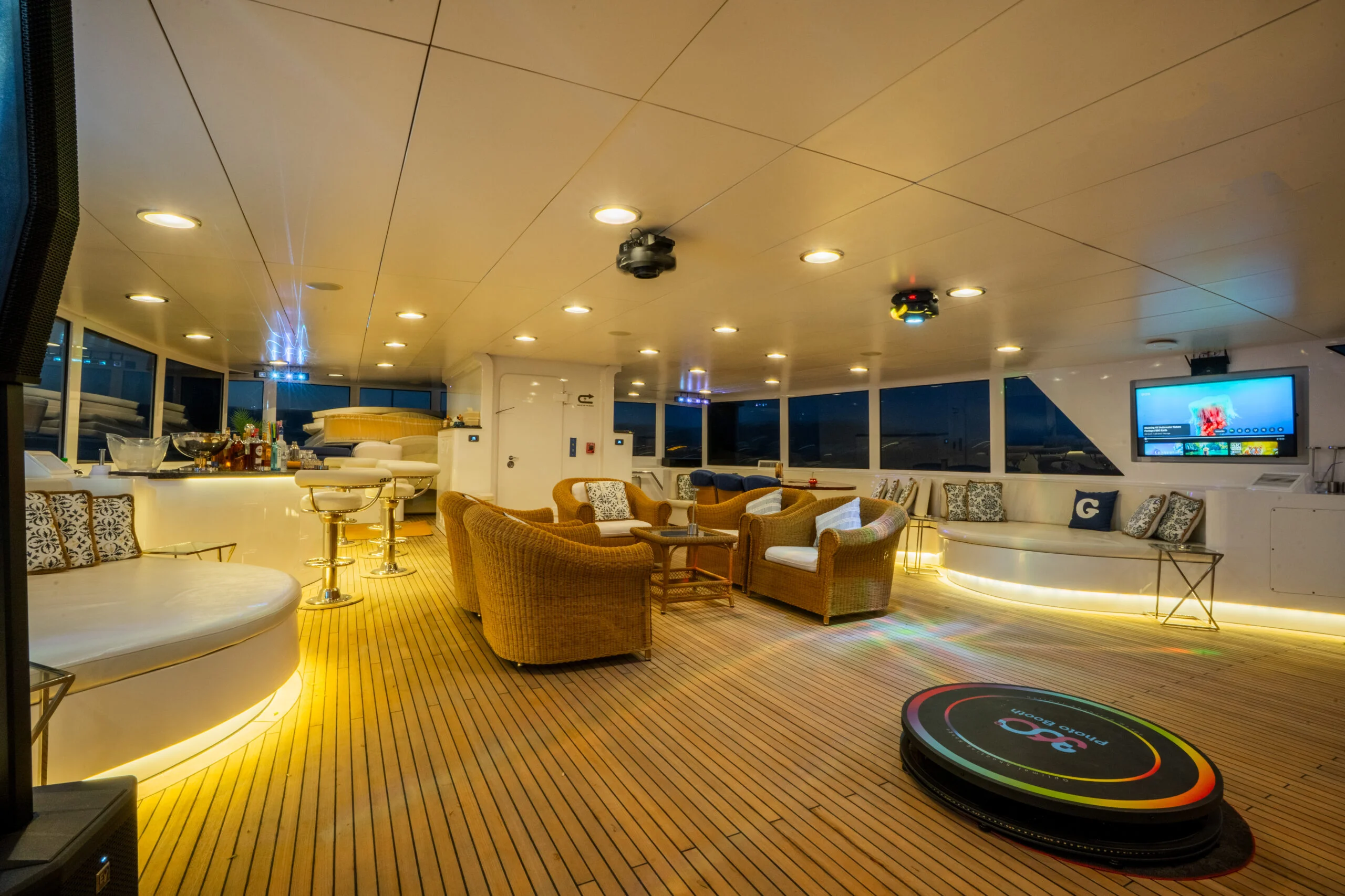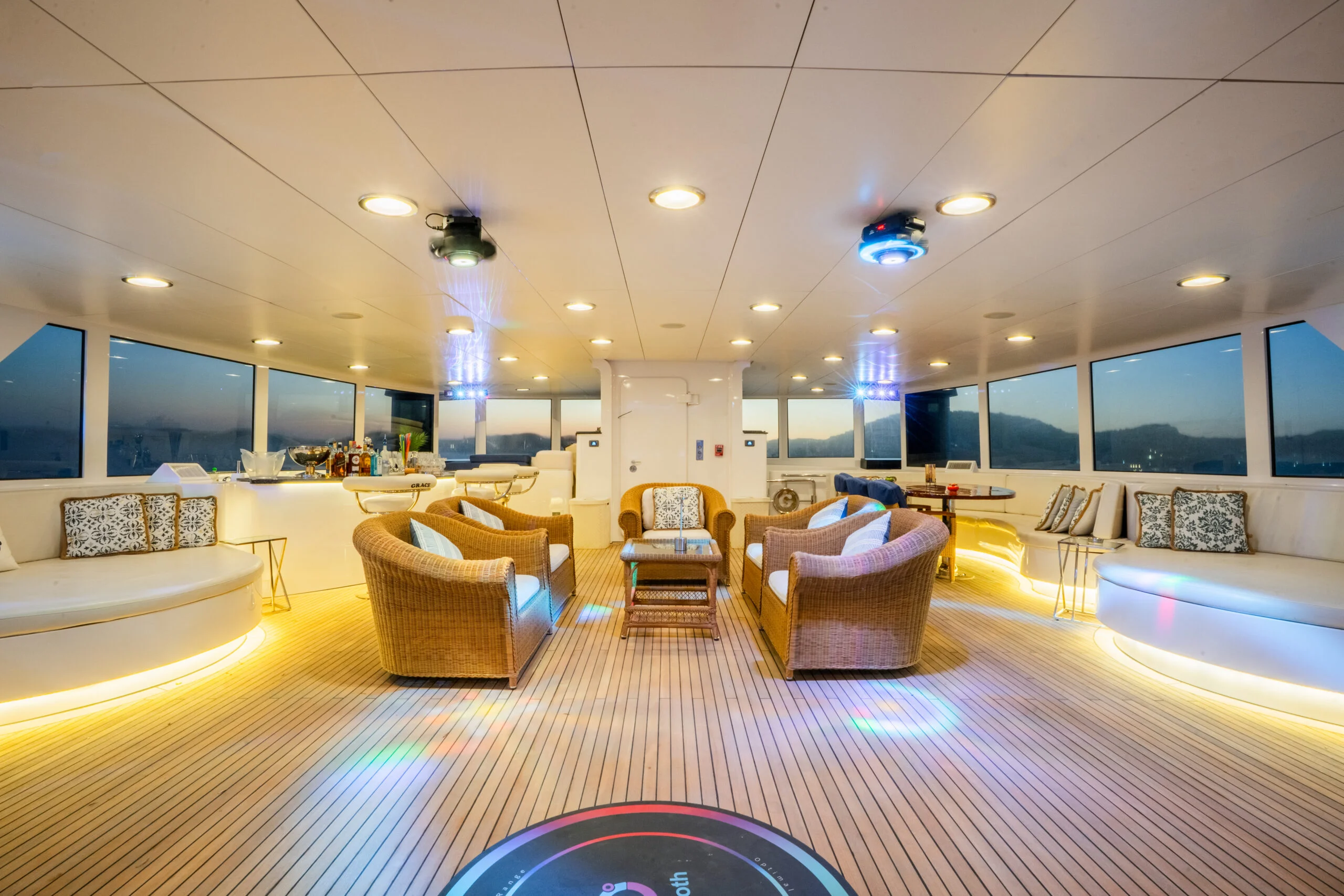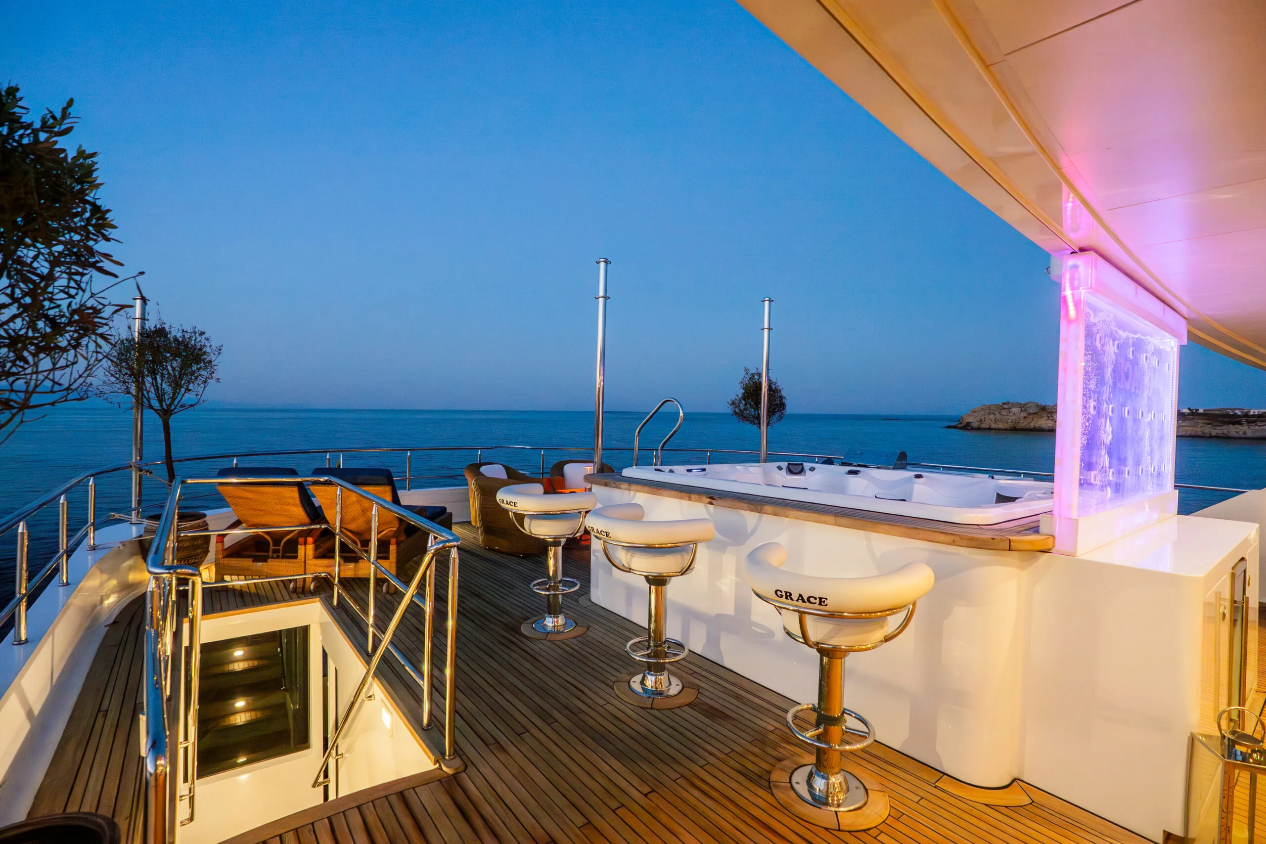 Relaxing evening on the deck of Grace Yacht featuring a bar and comfortable seating